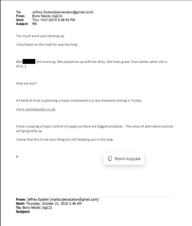 Yazışmalarda ayrıyeten Bill Gates’in eski danışmanı Boris Nikolic, Epstein’e bir arkadaşının Türkiye’de az element madenciliğine büyük bir yatırım yapmayı planladığını söylüyor.