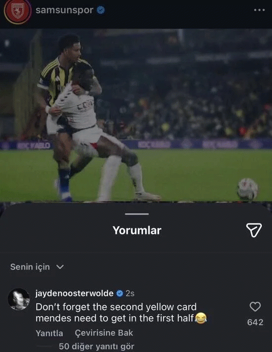 Fenerbahçe’nin Hollandalı savunmacısı Jayden Oosterwolde, Samsunspor’un kendisi hakkında toplumsal medyada yaptığı paylaşıma karşılık verdi. Oosterwolde, Karadeniz grubunda forma giyen Mendes’in birinci yarıda oyundan atılması gerektiğini belirtti.