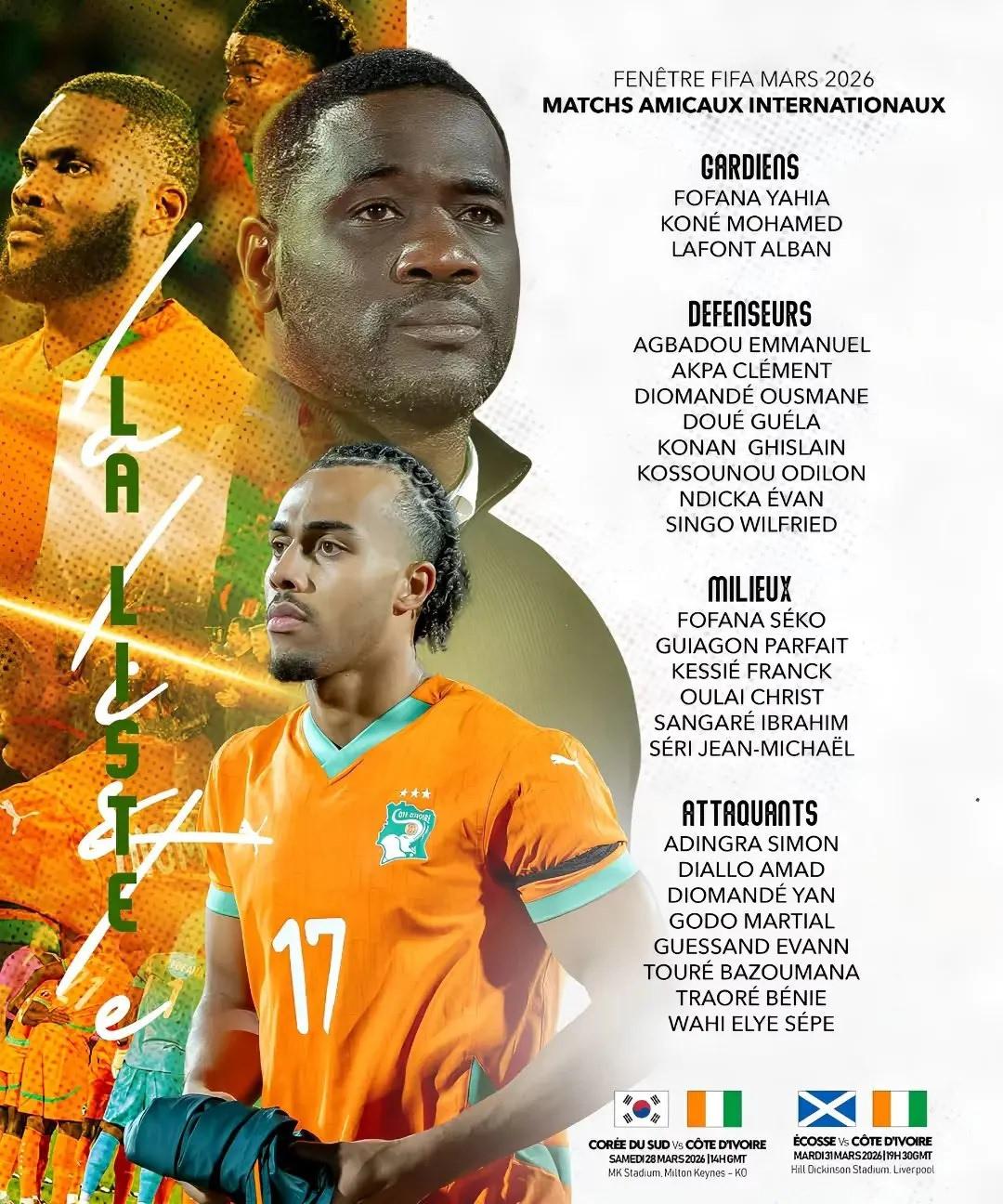 Fildişi Kıyısı, liglere verilen ortada Güney Kore ve İskoçya ile hazırlık maçlarında karşı karşıya gelecek.