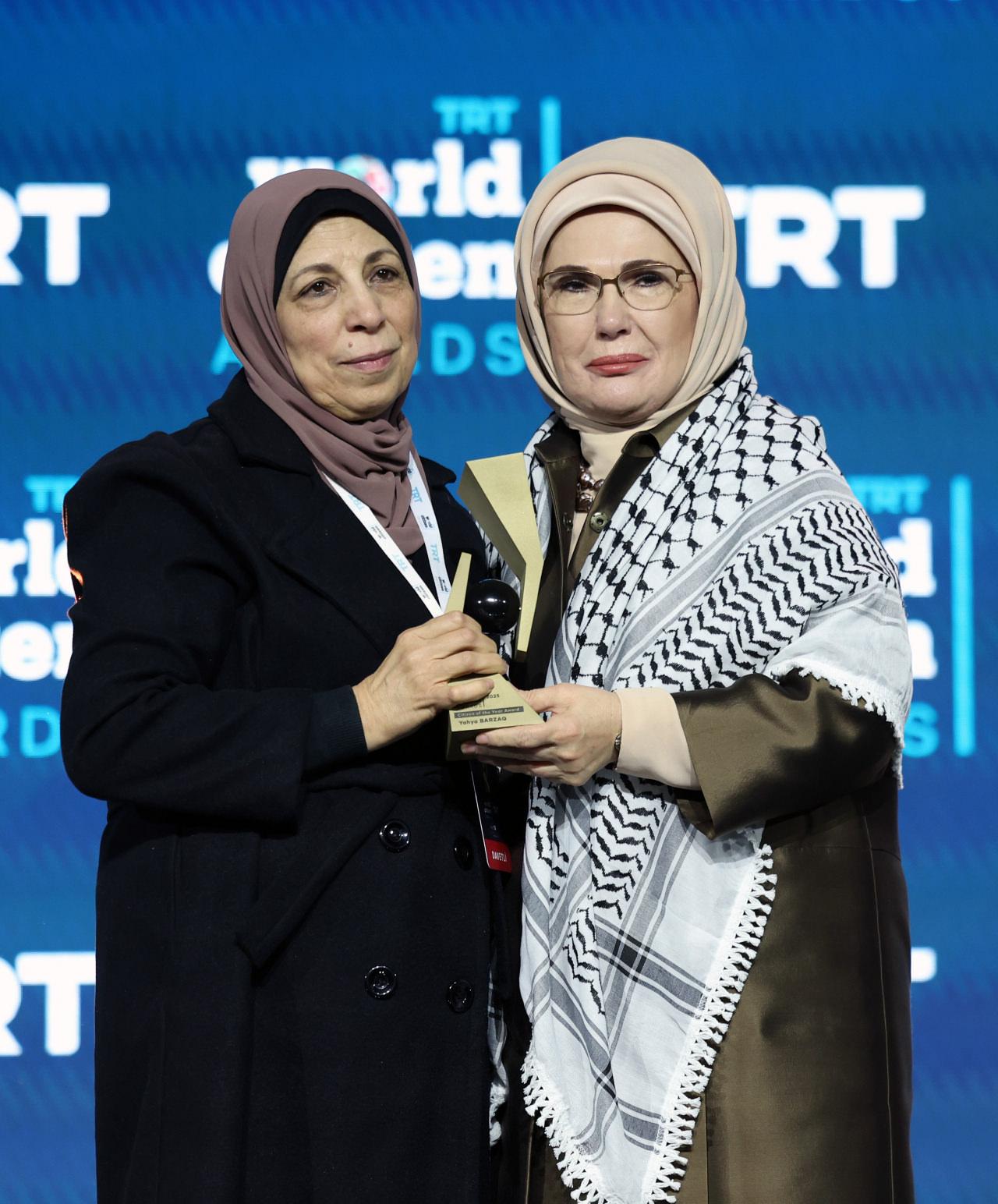 TRT World Citizen Mükafatları merasiminde Gazze’de vazife yaparken hayatını kaybeden foto muhabiri Yahya Barzaq’ın “Yılın Dünya Vatandaşı Ödülü”nü annesi Yousra Barzaq aldı. Barzaq, omzundaki Filistin kefiyesini Emine Erdoğan’ın omzuna koydu.