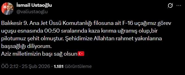 Son dakika haberi… Balıkesir Valisi İsmail Ustaoğlu, 9. Ana Jet Üssü Komutanlığına ilişkin F-16 uçağının misyon uçuşu sırasında düştüğünü ve bir pilotumuzun şehit olduğunu duyurdu.
