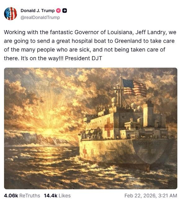 “Louisiana’nın kusursuz Valisi Jeff Landry ile birlikte çalışarak, Grönland’da hasta olan ve gerekli bakımı alamayan birçok beşere yardım etmek için mükemmel bir hastane gemisi göndereceğiz. Yolda!!!”