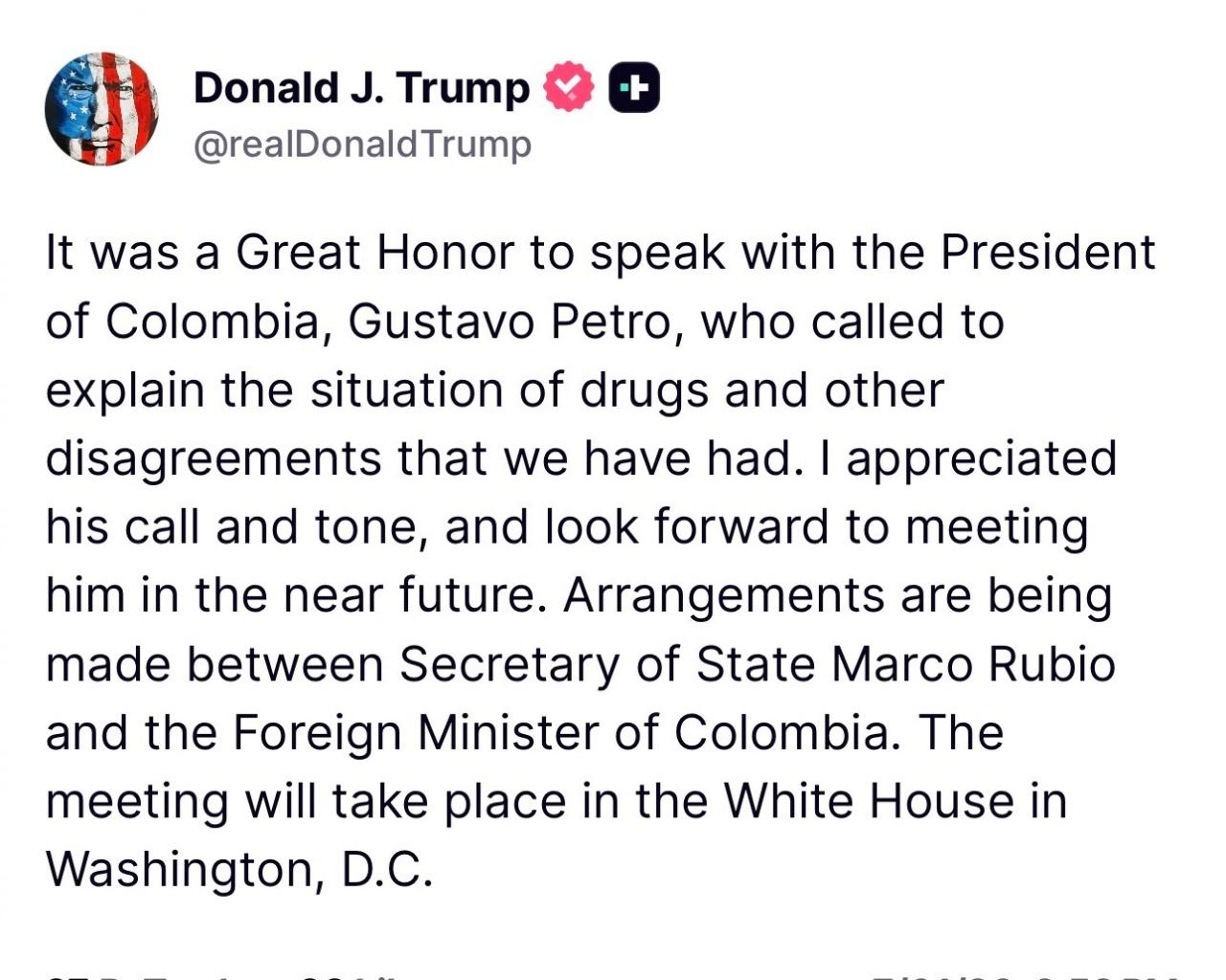 Trump, ABD ile Kolombiya dışişleri bakanları ortasında Beyaz Saray’da yapılmak üzere görüşmeler planlandığı bilgisini de paylaştı.